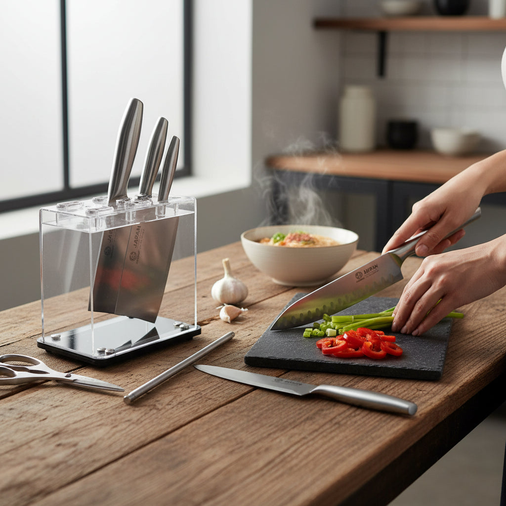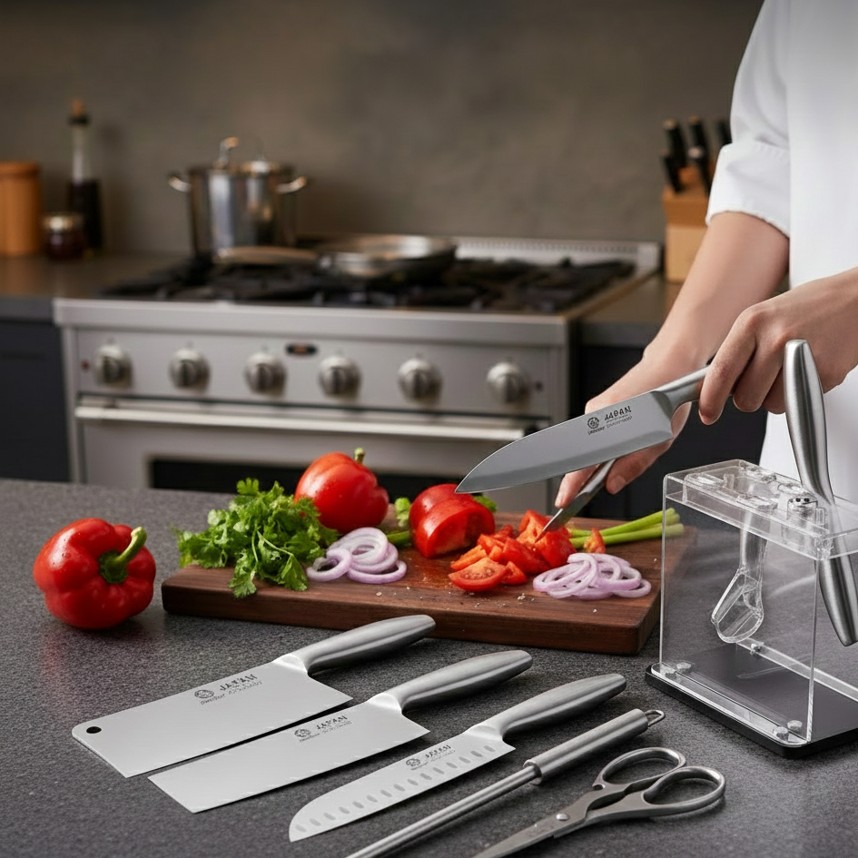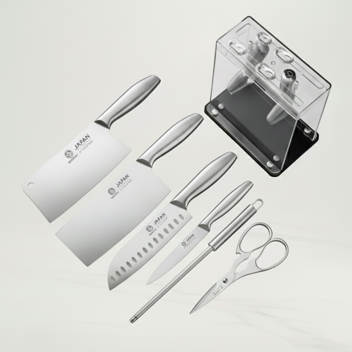 Cet ensemble japonais de six couteaux essentiels, accompagné d’un aiguiseur, d’une pince à légumes et de ciseaux multifonction, allie élégance et performance. Les lames en acier inoxydable assurent des découpes précises, tandis que les poignées ergonomiques offrent confort et stabilité. Le support en acrylique permet un rangement sûr et esthétique.