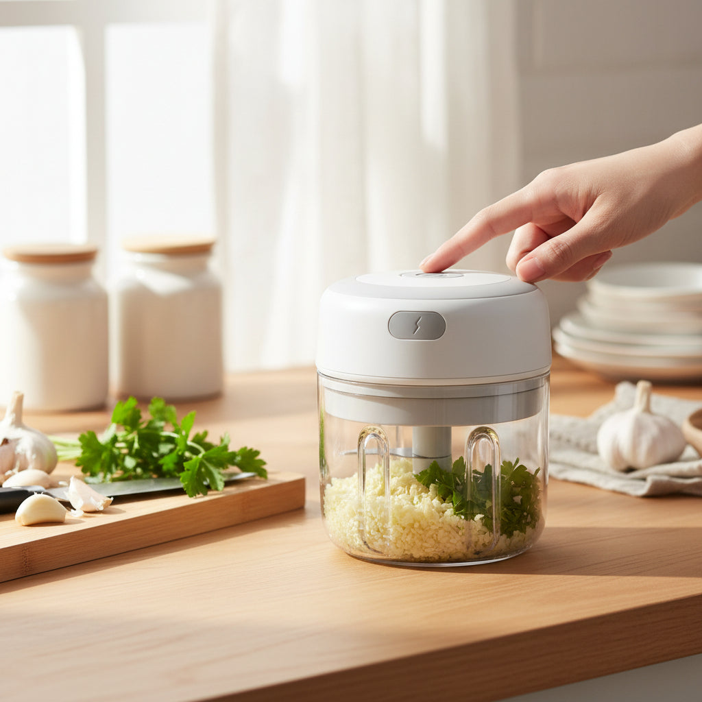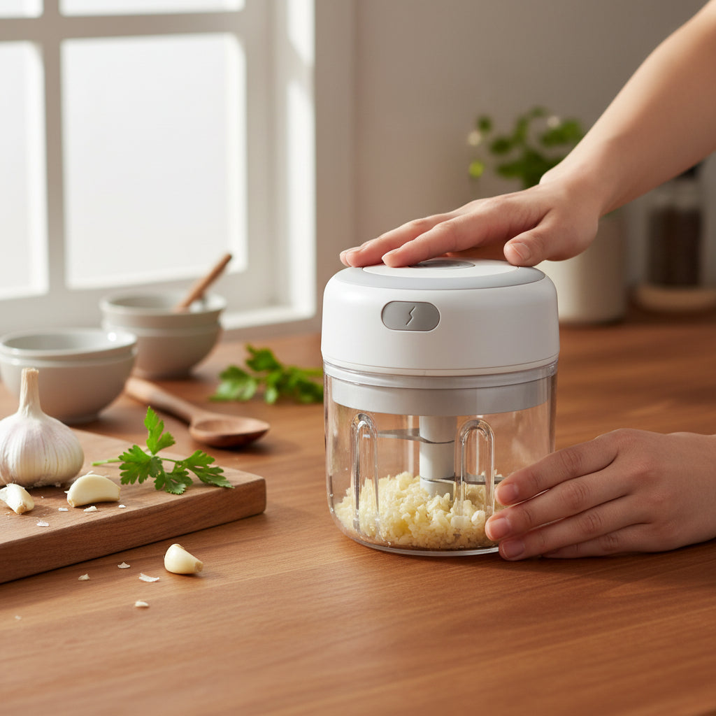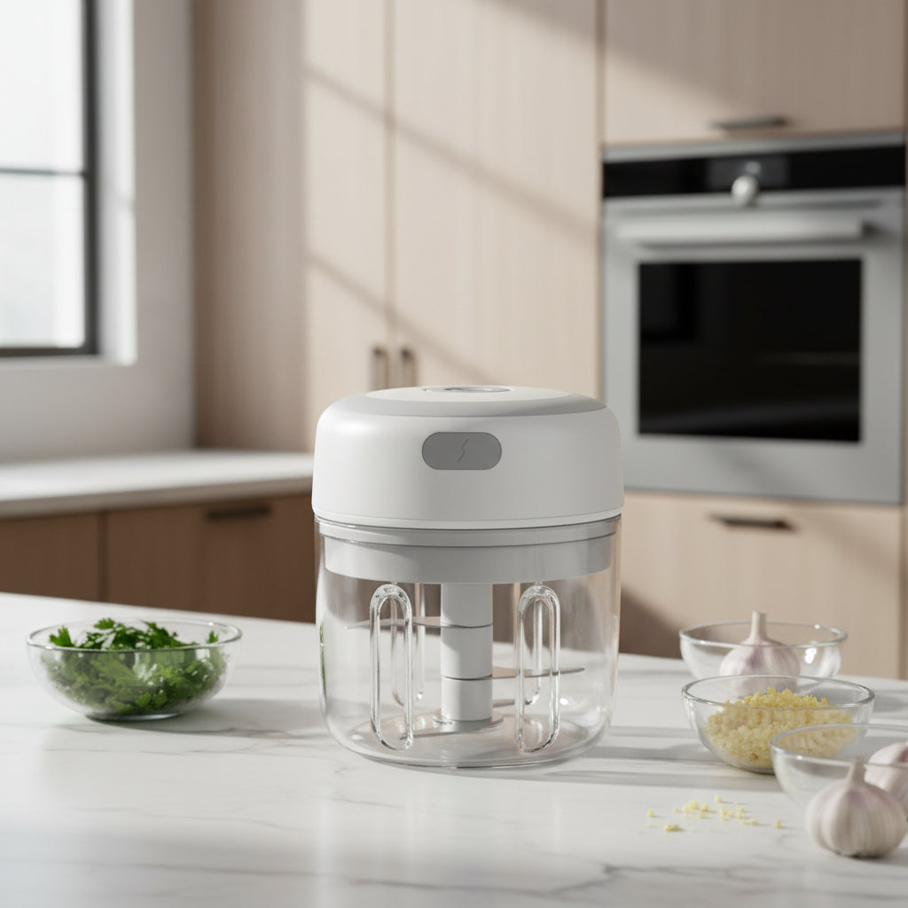 Ce hachoir électrique portable, compact et facile à utiliser, hache rapidement ail, oignons, herbes et légumes grâce à ses lames automatiques. Son bol transparent permet de contrôler la texture, et son couvercle verrouillable assure stabilité. Rechargeable par USB, il s’utilise partout, à la maison ou en déplacement.
